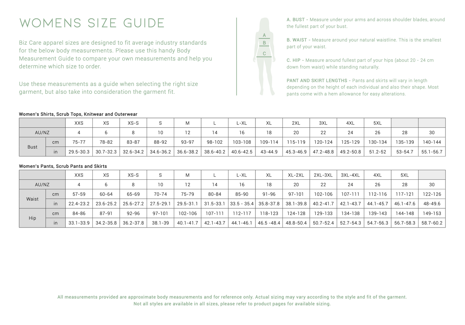 please use this link for detailed sizing