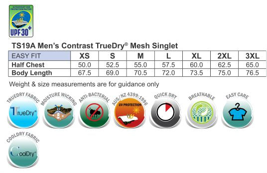 Fabric: TrueDry® Cotton Back Micromesh with Moisture-Wicking. 160gsm - 60% Cotton, 40% Polyester.